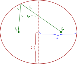L'ellisse è una figura geometrica in cui, per ogni punto del contorno, la somma delle distanze r1 e r2 da due punti fissi detti fuochi è la stessa. Il segmento che passa per i due fuochi è detto asse maggiore mentre quello ad esso perpendicolare e passante per il centro, asse minore.
